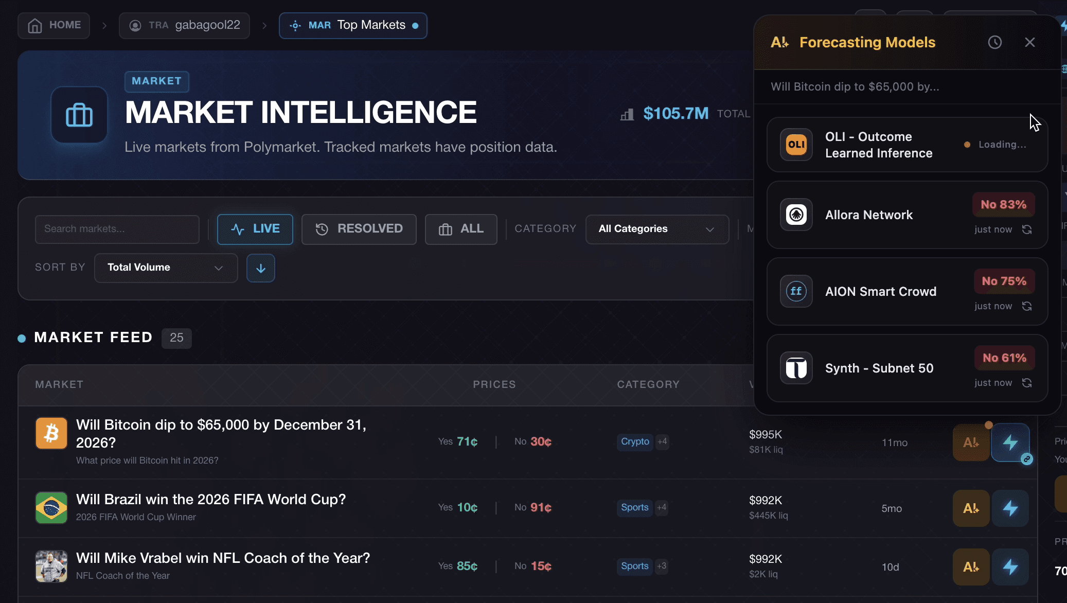 Access high-performance predictive signals from decentralized intelligence networks such as Bittensor and Allora. Select individual models or aggregate multiple sources to inform your market decisions.